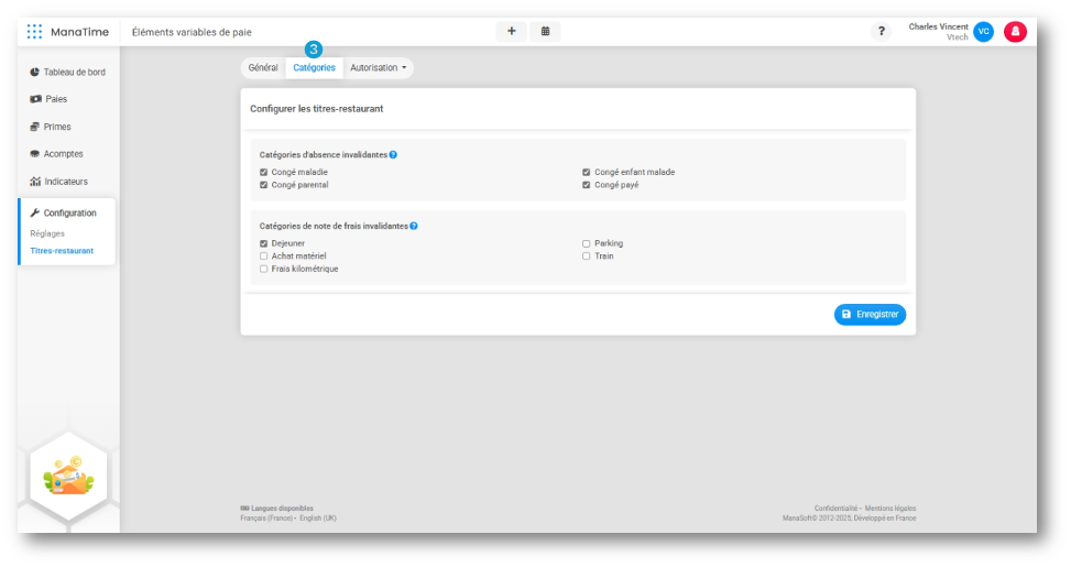3. En cliquant sur catégorie, cela vous permet d’indiquer les catégories qui annulent l’acquisition de titre restaurant pour la durée de l’absence ainsi que les catégories de note de frais qui annulent l’acquisition de titre restaurant pour la journée. Pour sauvegarder votre configuration, il est nécessaire de cliquer sur « Enregistrer ».