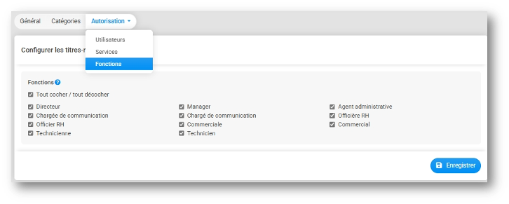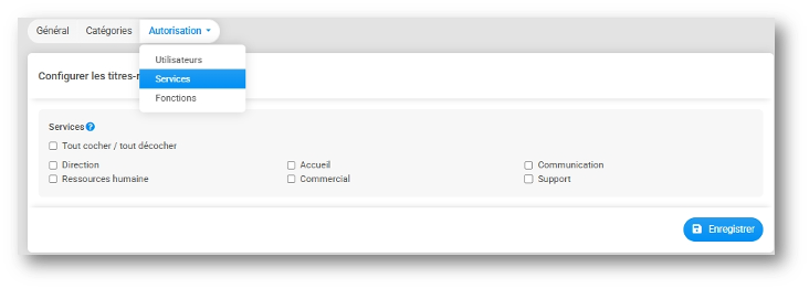 4. En cliquant sur Autorisations, vous pourrez configurer les utilisateurs, Services et Fonctions qui ont droit aux titres restaurant. Pour sauvegarder votre configuration, il est nécessaire de cliquer sur « Enregistrer ».