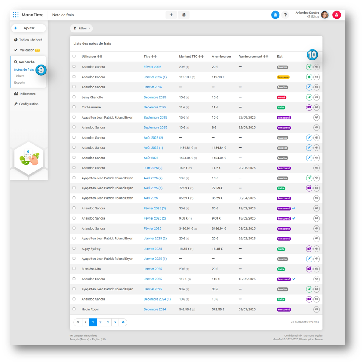 - Vous trouverez à droite des états de la Note de frais.