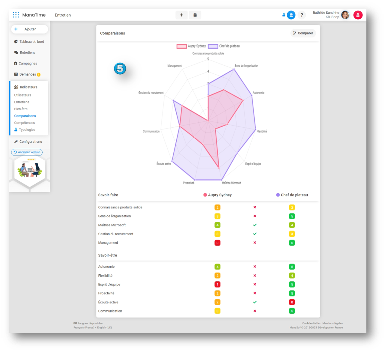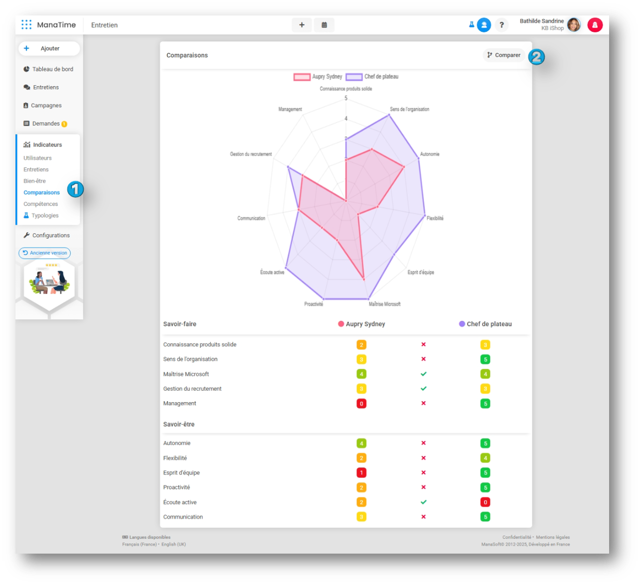 En tant que manager, vous avez la possibilité de comparer les compétences entre plusieurs collaborateurs ou par rapport à une fonction spécifique. Cela vous permet de visualiser les écarts de compétences et d’identifier plus facilement les besoins en formation.