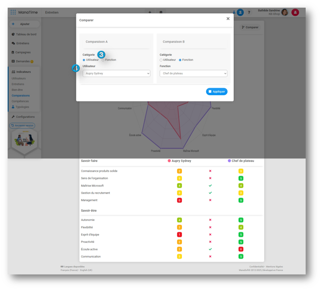 4. Choisissez l’utilisateur, la fonction, ou les deux selon le type de comparaison souhaité.