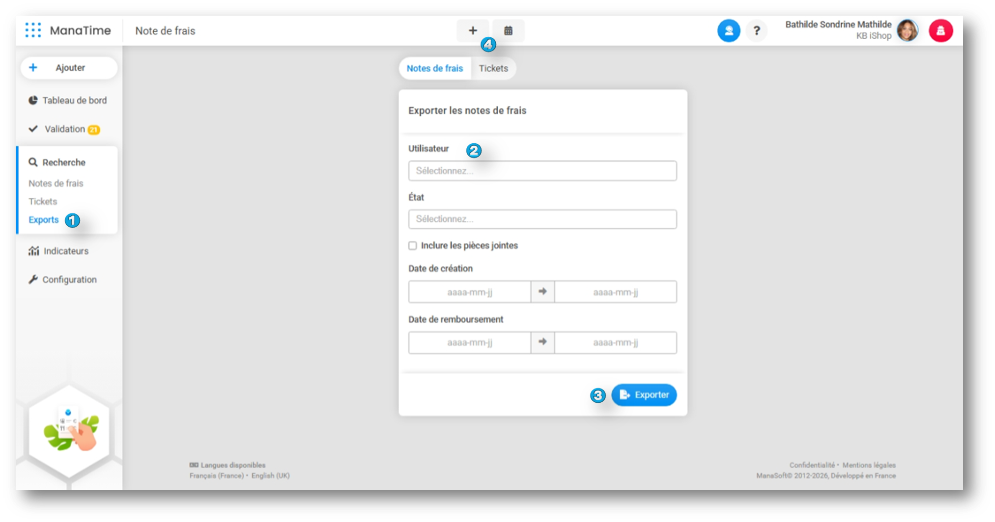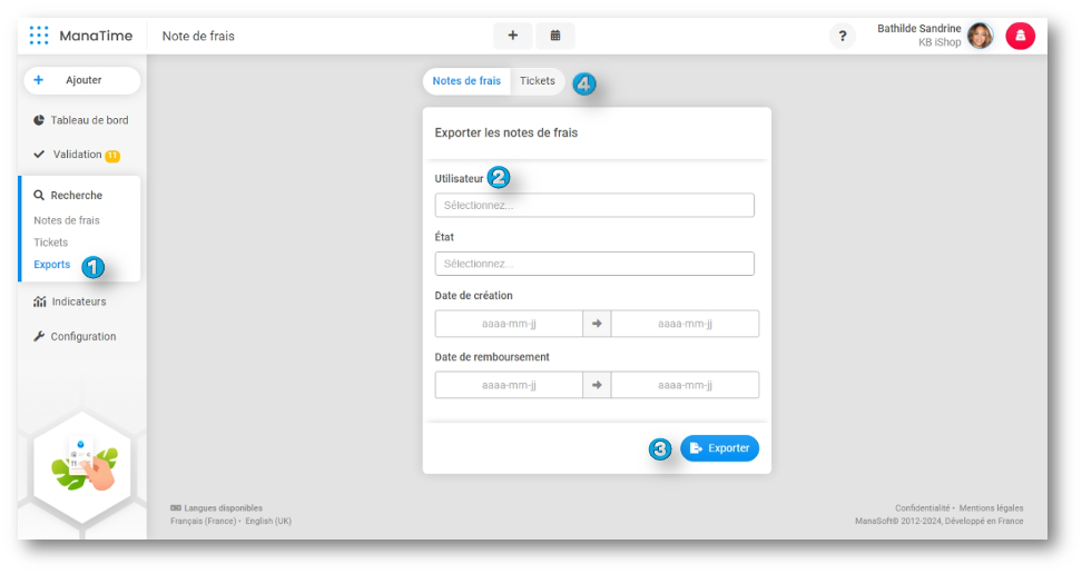 - Cet article a été réalisé avec un point de vue Export (rôle nécessaire pour exporter les notes de frais)