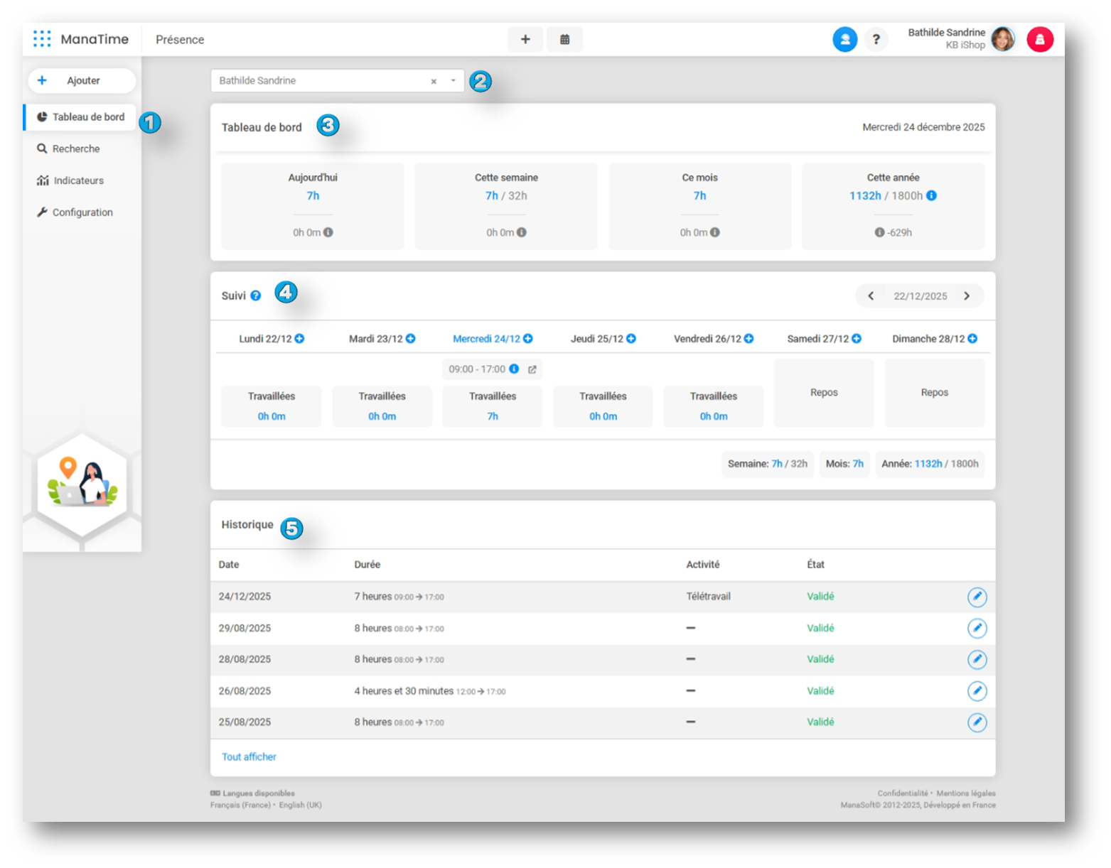 Sur ManaTime, chaque utilisateur, quel que soit son rôle, bénéficie d’un accès personnalisé à son propre Tableau de Bord. Cet outil centralisé regroupe vos soldes de congés, vos dernières absences déposées, vos demandes en attente de validation, ...