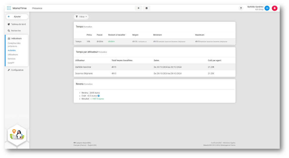 Activités : Cet outil vous permet d'identifier le temps passé par activité de façon global, mais aussi de chaque utilisateur passé sur ce dernier. Enfin, la troisième information disposée est le revenu de l'activité.
