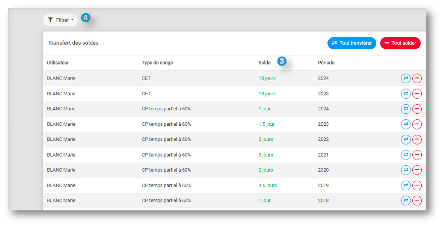 Si les reliquats d’absences (congés non pris) de la période précédente ne sont plus visibles dans les compteurs des collaborateurs, ils n'ont probablement pas encore été transférés. Voici comment les retrouver et les transférer :