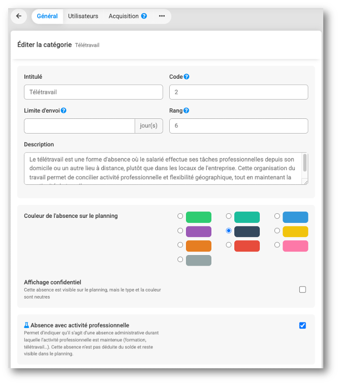 Distinguer les absences « avec activité » (télétravail, formation, déplacement professionnel) des absences « sans activité » (congés, maladie, etc.).