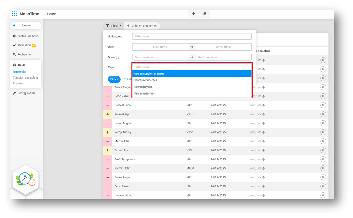Un nouveau filtre « Type » a été ajouté au formulaire de filtrage du module Heure > Solde > Recherche.