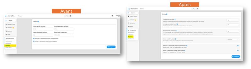 Cette nouvelle organisation rend la page plus intuitive, rapide à prendre en main et sécurisée pour la configuration des heures.