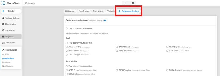 - Si l’utilisateur est coché pour Badgeuse physique → badgeage physique autorisé