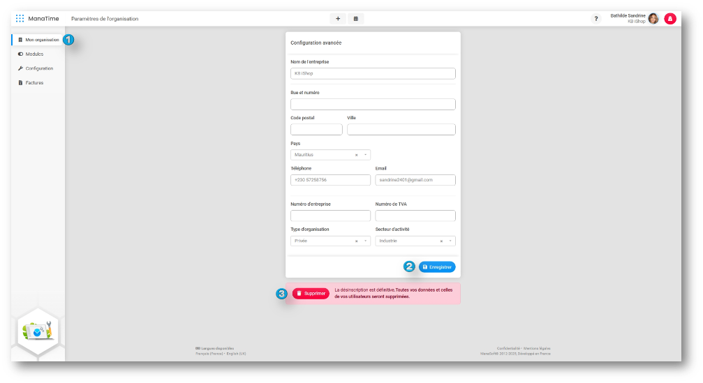 Ces données sont utilisées pour personnaliser vos documents, vos exports et votre environnement Manatime.