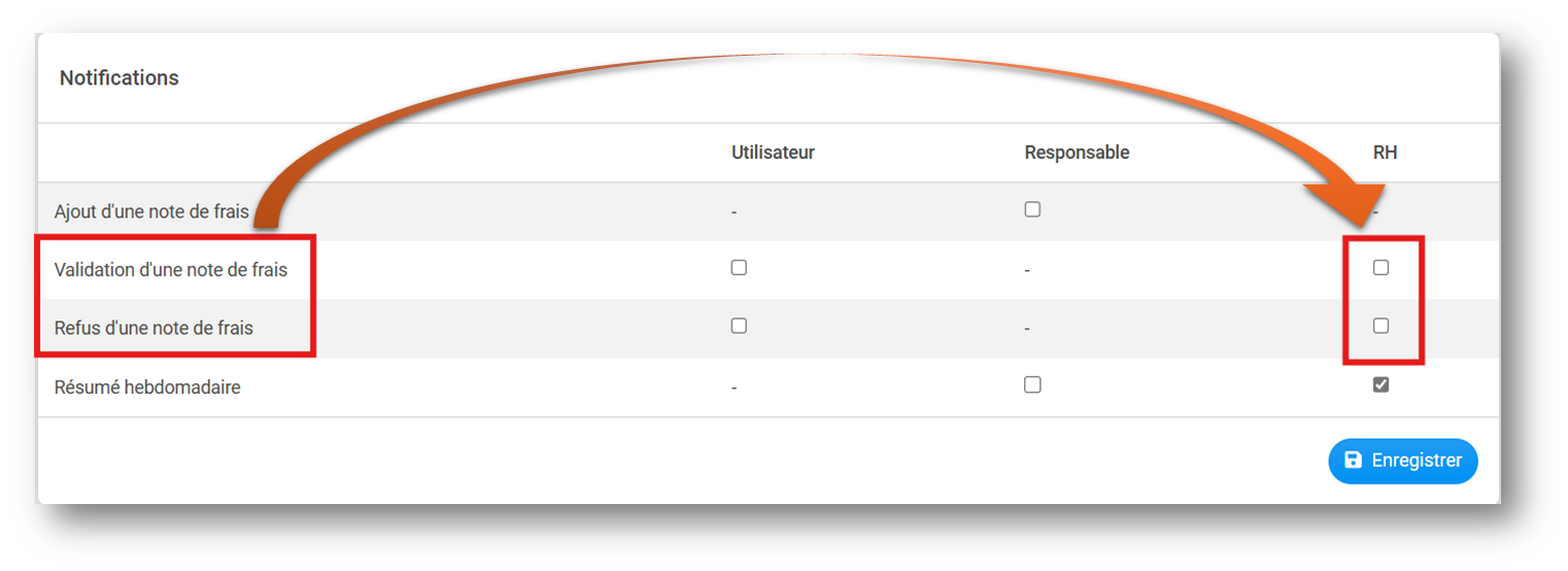 Pour renforcer le suivi et améliorer la réactivité dans la gestion des notes de frais, les utilisateurs R.H. peuvent choisir s'ils souhaitent recevoir une notification lors de l'étape de validation ou de refus d'une note de frais.