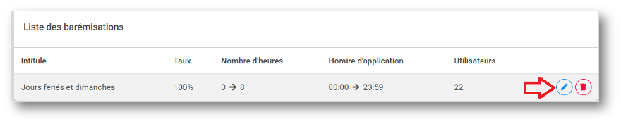 Dans le cas où les heures supplémentaires ne sont pas majorées, assurez‑vous que la configuration de la majoration des dimanches et jours fériés soient bien activés dans la section Barémisation : 1. Éditez la barémisation souhaités :