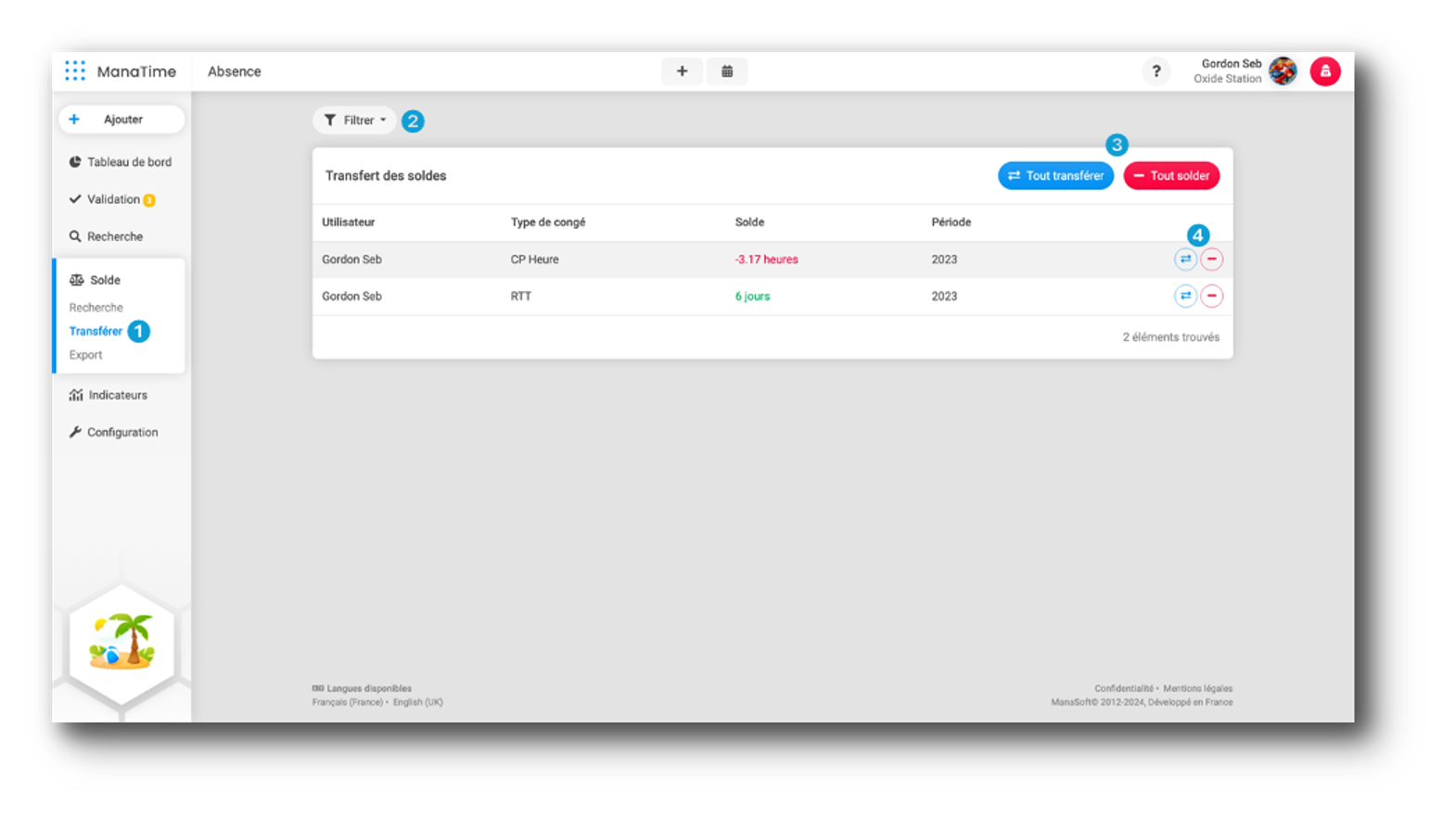 Rendez-vous dans le module Absence > onglet Solde > bouton Transférer.