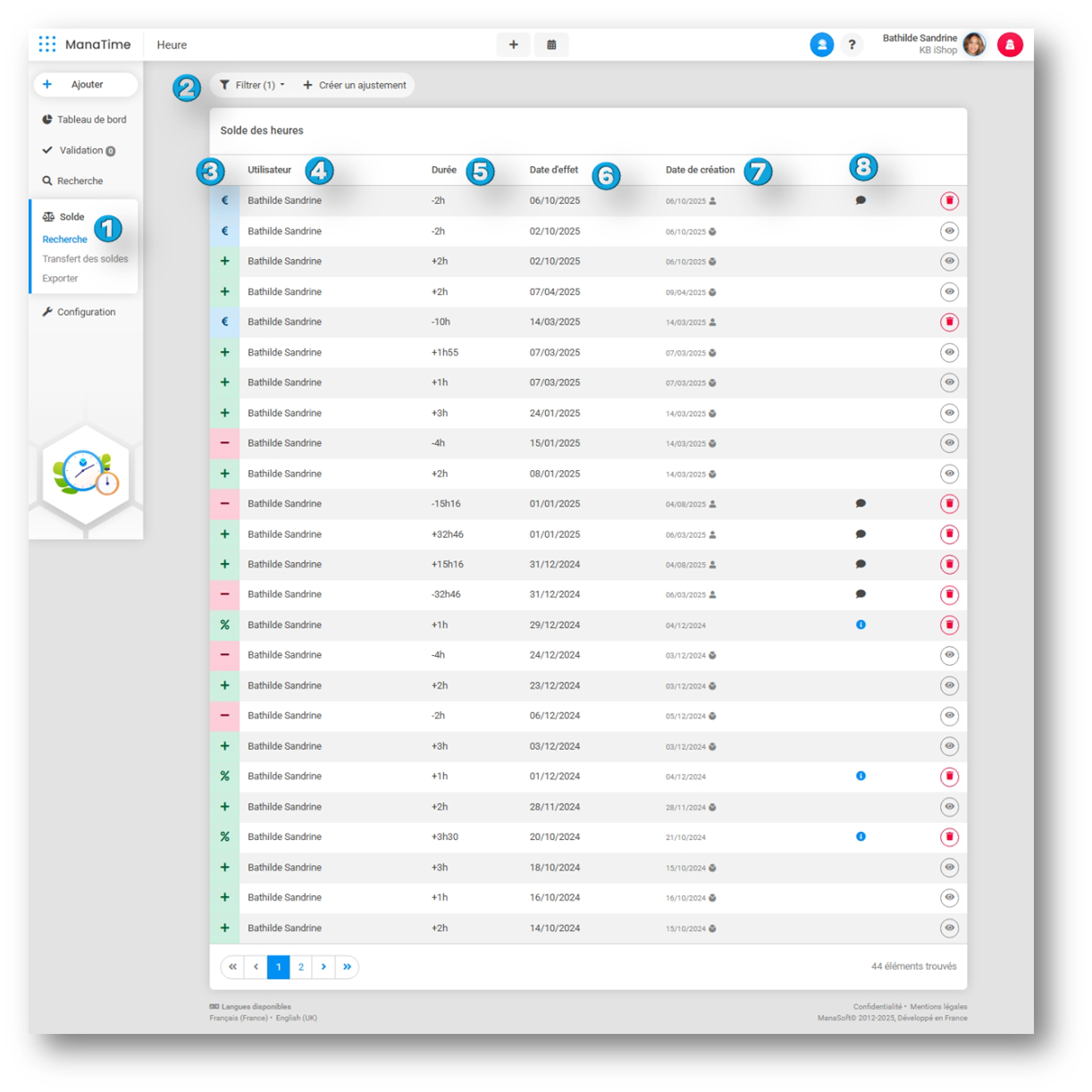 Plusieurs segmentations sont présentes (Exemple : catégorie, type de variation, etc.) et peuvent être très utiles afin de gagner du temps. - ** Selon le signe (- ou +), cela n'impactera pas de la même manière votre solde d'heure. Si la quantité est négative, alors ce sera une soustraction. Au contraire, si ce dernier est positif, une addition sera réalisée.