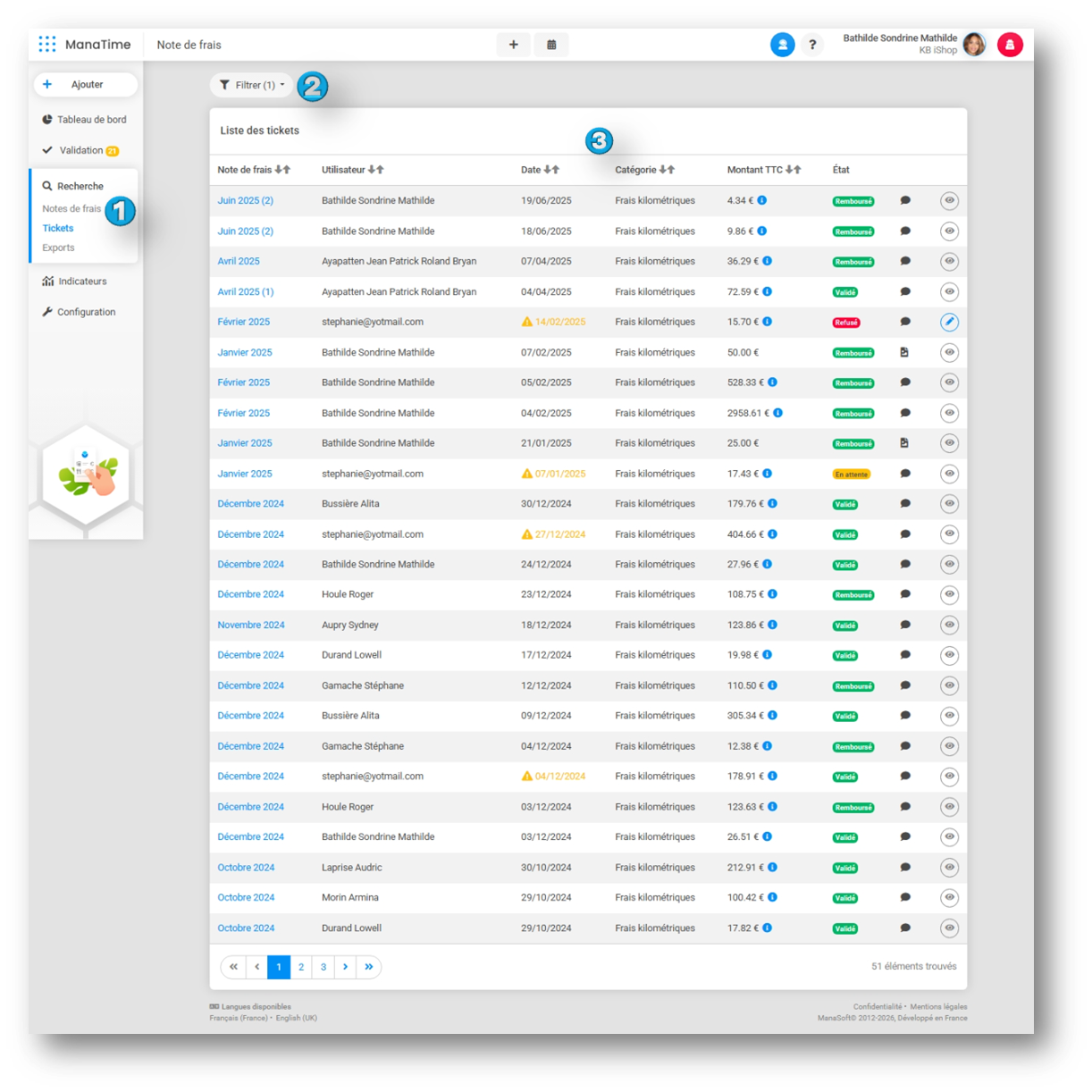 - Dirigez-vous dans le module Notes de frais > Ticket > Recherche