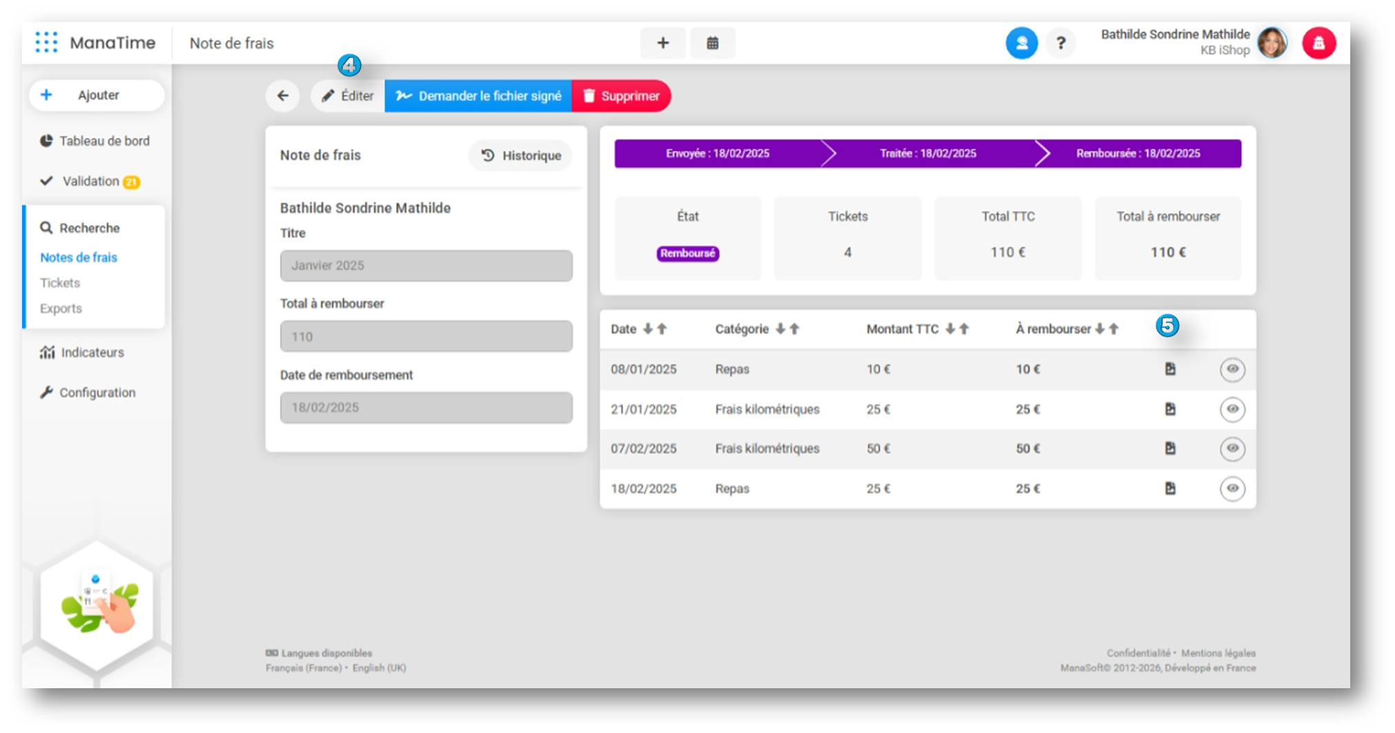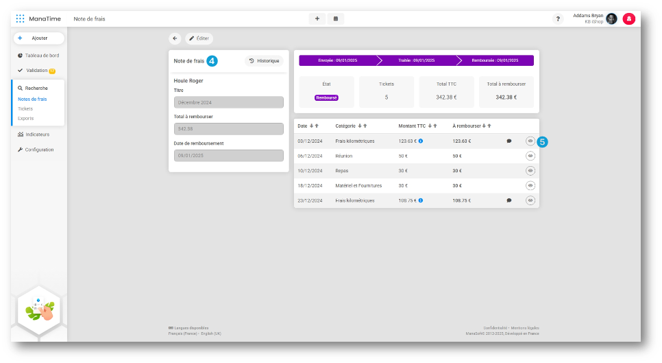 - Cliquez sur le bouton à droite de la note de frais souhaitée.