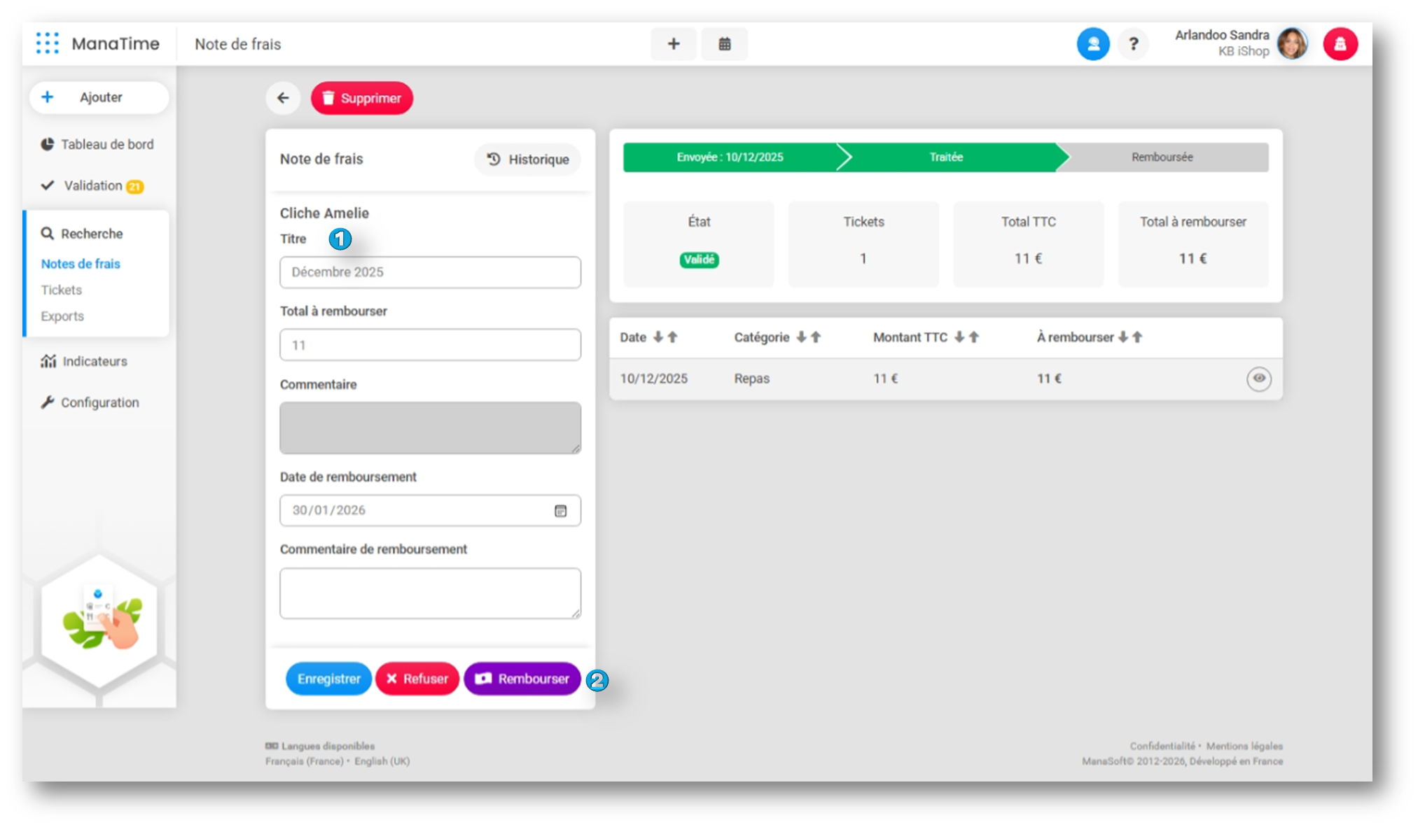 - Modifiez les informations de la note de frais et un commentaire de traitement/remboursement au besoin avant la validation