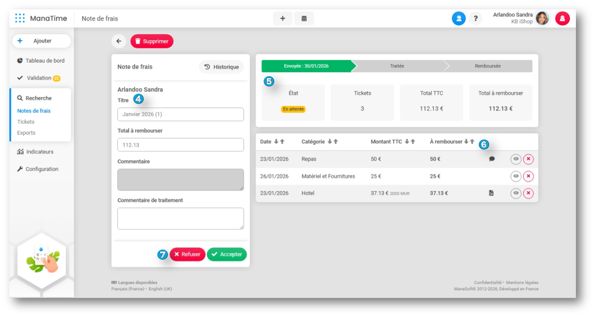- Vous accéderez ici à l'onglet de traitement, où il est possible de modifier la note de frais une dernière fois avant de valider ou refuser la déclaration. Vous pouvez également y ajouter un commentaire de traitement.