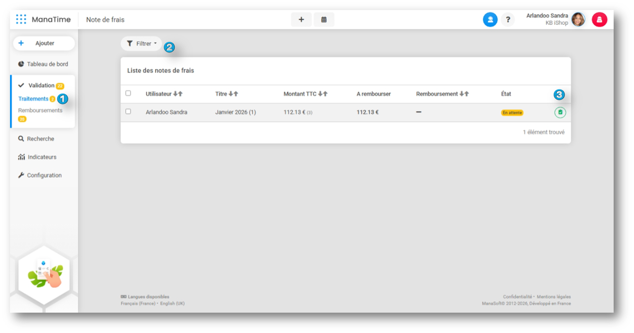 - Dirigez-vous dans le module Note de Frais > Validation > Traitements