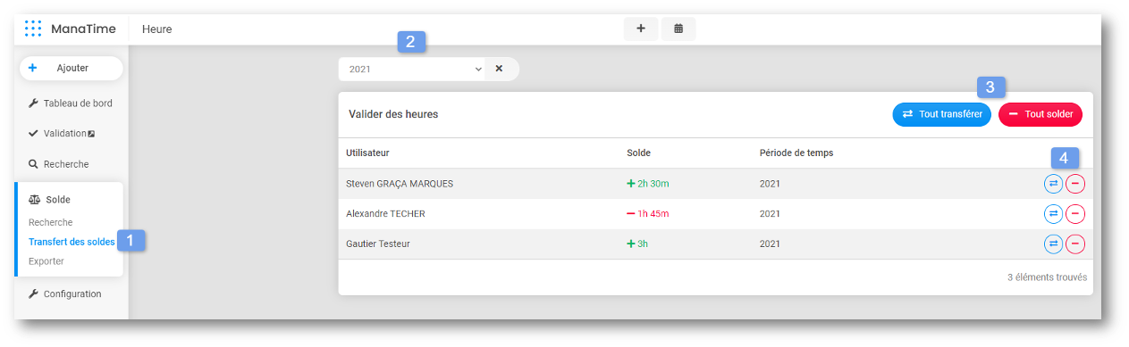 Chaque année, les Ressources Humaines doivent procéder au transfert des soldes afin d’assurer une gestion conforme des compteurs d’heures. Au début de la nouvelle période, les soldes sont automatiquement réinitialisés, et les anciennes données sont reportées sur la page de transfert dédiée.