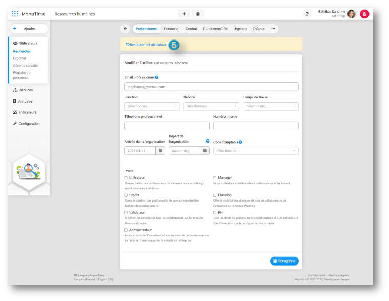 5. Cliquez sur “Restaurer cet utilisateur” afin de le réactiver