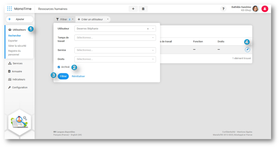 Saisissez le nom de l’utilisateur concerné, puis cliquez sur « Filtrer ».